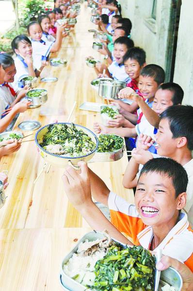 2007年,安利即资助了中国发展研究基金会“贫困地区寄宿制小学学生营养改善”项目,选择了广西都安县和河北崇礼县作为试点,对试点学校拨款补助,改善餐食,丰富了孩子们的小饭桌。10个月后,两个试点学校的学生的平均身高分别增长了4.5厘米和5.6厘米,学生的学习成绩、体育方面、心理状态均得到改善。这一成果为安利公益基金会“春苗营养计划”的实施提供了科学的依据。上图为广西百色市田东县作登瑶族乡新安村小学的同学们新学期第一顿营养午餐。