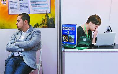 两名俄罗斯的大学生在自己的展位前。本次“挑战杯”首次设立“主宾国”制度,来自俄罗斯的大学生现场展示自己的作品,并与中国大学生进行交流。
