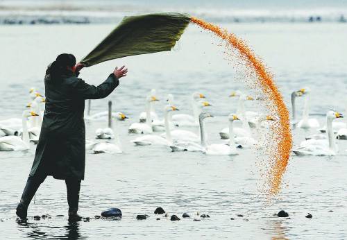 河南省三门峡黄河湿地保护区是中国三个主要的天鹅越冬栖息地之一,每年冬季都有大批天鹅从西伯利亚飞临这里觅食、定居。为了留住和保护天鹅,自2008年开始,三门峡市政府每年拨出10万元专款,为天鹅购买玉米谷类等“商品粮”,定时、定点、定量给天鹅补充食物,为它们“越冬度假”创造良好的生存环境。