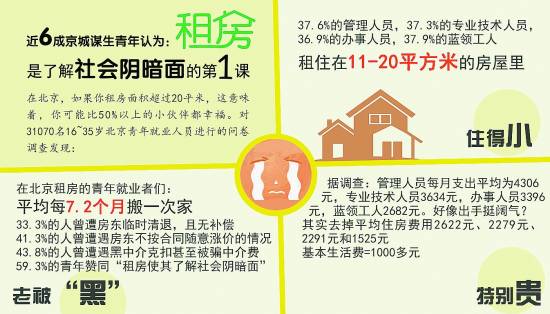 近2/3的青年就业者租房或住集体宿舍;近1/5的管理人员、近15%的专业技术人员和办事人员住地下室和平房;近1/3的蓝领工人、约1/5专业技术人员和办事人员、16.5%的管理人员租住在11平方米以下的房子里。青年租房者平均每7.2个月搬一次家,59.3%的青年赞同“租房是其了解社会阴暗面的第一课”;扣除房贷和房租费用,受访的3个白领职业群体的青年月均支出1000多元,仅够维持基本生活,约1/4的人是“月光族”或“负翁”。住房问题是当前青年就业者第一烦恼的事。