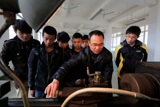 图为1月28日,一名老师在广西柳州市融安县职业技术学校为学生辅导车床操作技巧。