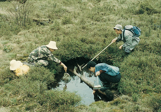 “我们的研究对象在大山里、高原上、沼泽边……”费梁说,每年三月至八九月间,他就出发寻找两栖动物的栖息地,几乎“翻遍”整个中国的湖、塘、池、沼。在野外,他白天探测环境,晚上“去和蛙呀、螈呀相遇”。