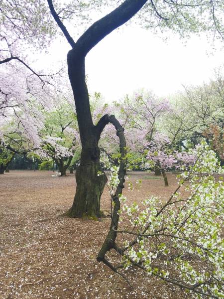 第三次去是在4天之后,和妈妈一起去赏花。依然是御苑,却带给我不同的震惊。那些花果然如阿姨所说盛开了。明明是那么一朵一朵的小花,聚在一起却能成为一棵树。我仿佛听到它们盛开时的笑声——那必定是带着成功的喜悦。明治中后期开始遍布日本的品种染井吉野,看起来竟像是从树干上钻出了几朵花。短短几天,这种看似脆弱的小花就像筑起一夜城一般奋力地攀上树梢,安营扎寨,静静盛开。无数樱花齐放之时,那股气势简直像是要把天地也染为樱色。