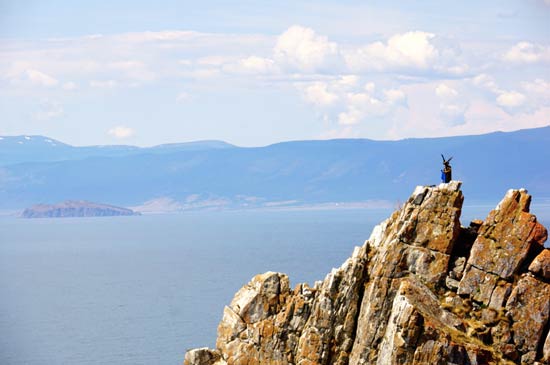 突然,看到萨满石最高点出现了一个穿着奇异服装的人,手里拿着鼓,嘴里呐喊着什么,时不时将一种液体洒向空中。这应该是他们的祈福仪式,而我身后,也坐着几个布里亚特人,开始摇头晃脑,嘴里颂咏着什么。此情此景,为这广阔的贝加尔湖增加了几分神秘。
