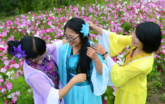 8月5日,参加体验活动的游客在花田中扮成“花仙子”。当天,西藏尼木县吞达村举行首届格桑花旅游文化体验活动。游客们在活动中尽情赏花,体验藏族手工艺制作过程。