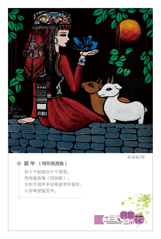 《十三个民族十三朵花》系列装饰画在印制成明信片时配了短诗,诗文的作者是李淑敏43岁的母亲刘玉萍。她在《塔吉克族》这幅画的配诗《憧憬》中写道:“在离太阳最近的冰山下,跳动着一颗拥抱太阳的虔诚之心。高原上奶茶飘香,滋养着少女对美好未来的无限憧憬。”
