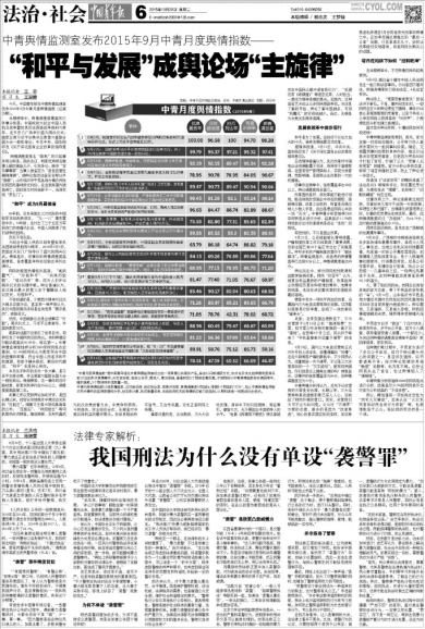 今天,中国青年报社中青舆情监测室发布2015年9月中青月度舆情指数(总第25期)。