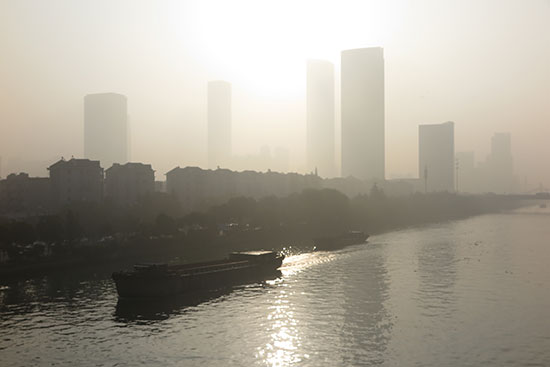 10月23日,船行驶在大雾弥漫的京杭大运河无锡段。当天,我国多地遭遇大雾袭击。