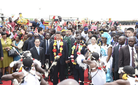 穆加贝在机场举行隆重欢迎仪式。军乐队奏中国国歌,鸣21响礼炮。在穆加贝陪同下,习近平登上检阅台。习近平检阅仪仗队,军乐队奏津巴布韦国歌。津巴布韦儿童向习近平和穆加贝献上花环,向彭丽媛和穆加贝夫人献上鲜花。前来参加欢迎仪式的津巴布韦政府内阁部长、外国驻津使节等在红地毯旁列队,当地民众跳起欢快热情的传统舞蹈,欢迎习近平和彭丽媛到访。在机场通往下榻酒店的街道沿途,数万津巴布韦民众载歌载舞,夹道欢迎习近平和中国代表团。