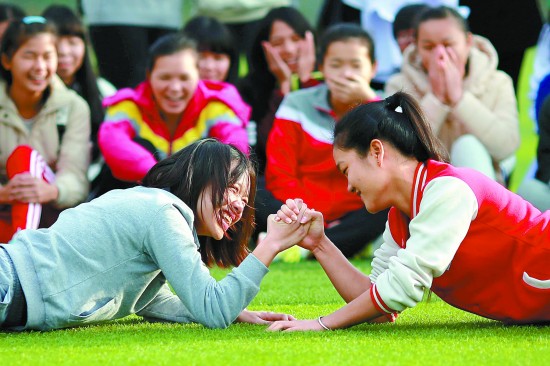 12月8日,在桂林医学院足球场上,覃思与一名同学在比手劲。