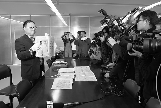 12月8日,南京市档案馆工作人员向记者展示该馆公布的“南京大屠杀案敌人罪行调查委员会第二次会议记录”档案原件。
