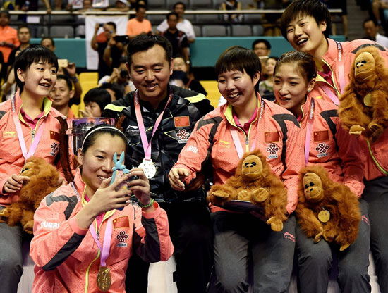 3月6日,马来西亚,2016吉隆坡世乒赛女团决赛,中国队以3∶0击败日本队,第20次捧起女团冠军奖杯。图为女乒教练和队员在领奖台上自拍。视觉中国供图