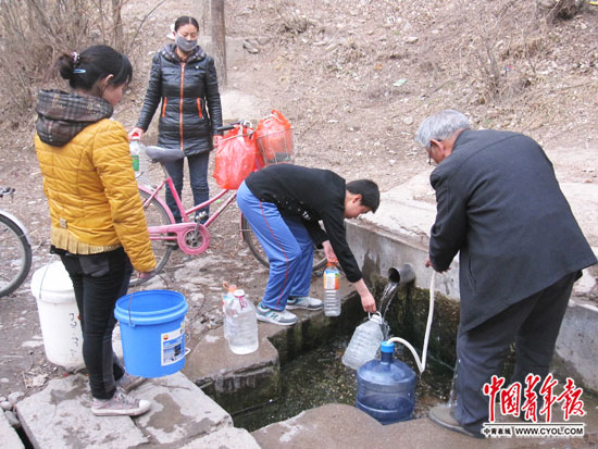 “早上6点到8点人最多,那时来打水的人能排出10米长队。”在这里打了半个月水的小赵很有经验。小赵家住在县城东部江源·都市花园的6层。从3月初开始,小赵每晚都要在赵家泉灌满两个50斤重的水桶和4个1斤的可乐瓶,再骑着摩托,把水运回两公里外的家。
