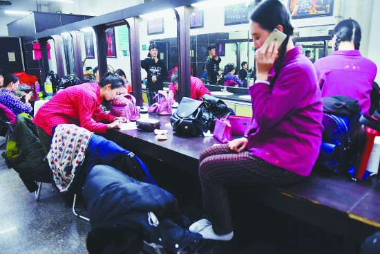 26岁的刘佳乐(左二)是山西省话剧院的话剧演员,工作4年来一直演绎着各种“龙套”角色。她还兼任前台主任,每次开演前总要记录考勤等情况。连台词都没有,她依然很努力地去演。“龙套妹”是她对自己的调侃,说起这个绰号,她总会跟上一句:“但是我不会永远都是‘龙套’。”