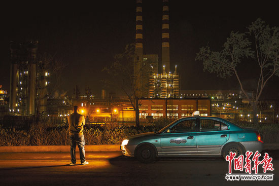 4月13日晚上8点,河北省迁安市木厂口镇松汀村南,出租车司机雨田将一名乘客送抵目的地后,站在车头大灯前,久久注视着眼前灯火通明的钢厂。他身后的马路上,不时有拉着原料的卡车向着厂区方向飞驰,掀起一阵呛人的烟尘。