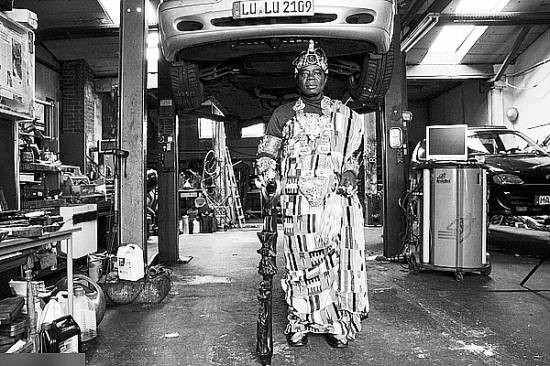 这位国王来自加纳霍霍埃地区,今年67岁,娶了一位德国姑娘做王后,有两个混血孩子。1987年,他接到“继承王位”的传真时,已经来德国17年了,获得了汽车修理方面的两本技师资格证书,并经营着自己的汽车修理店。