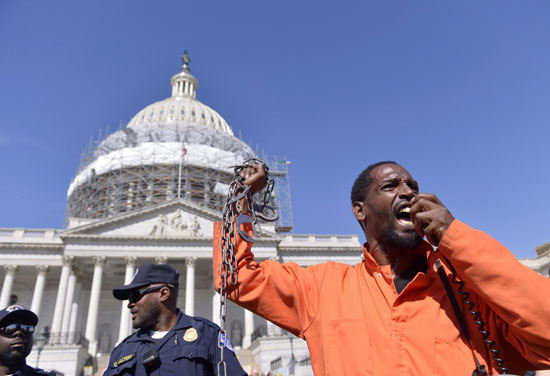4月18日,在美国首都华盛顿国会山,一名参加抗议“金钱政治”的示威者在喊口号。