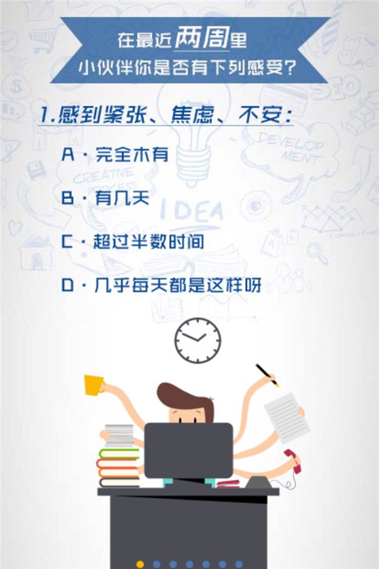 测试所选用的题目来源于由Spitzer等人编制的“广泛性焦虑量表(GAD一7)”,该量表用于广泛性焦虑的筛查及症状严重度的评估,是患者健康问卷的一个组成部分。