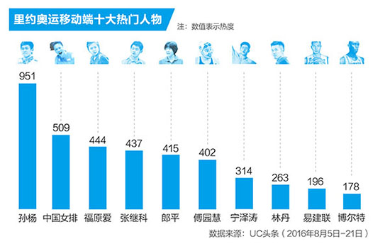 里约奥运会正式落幕,谁才是中国军团里的最大红人?日前,UC发布的“UC头条奥运会大数据——移动端奥运人物热榜”显示,截至最后一个比赛日,孙杨仍高居奥运十大热门人物之首,中国女排、福原爱分列第二、第三。
