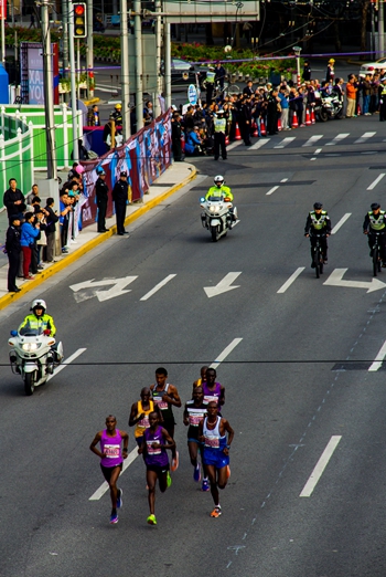 今早7点,2016上海国际马拉松(以下简称“上马”)在外滩金牛广场鸣枪起跑。2小时10分18秒后,来自南非的A1001号选手莫库卡成为男子组冠军,16分钟后,埃塞俄比亚姑娘德雷杰率先冲过女子组终点线。