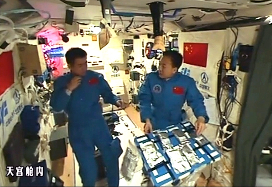 11月4日,航天员景海鹏(右)在天宫二号介绍太空中的饮食。航天员当天吃的东西有:早餐有粳米粥、椰蓉面包、五香鹌鹑蛋、酱香芥菜等,总共7种食品;中午有8种,包括什锦炒饭、肉丝炒面、土豆牛肉、紫菜蛋花汤等;晚上有8种,有绿豆炒面、牛肉米粉、虾仁鸡蛋、什锦罐头等;加餐有5种,包括麻辣猪肉、蟹黄蚕豆、香辣豆干等。饮品包括各类果汁和菜汤。