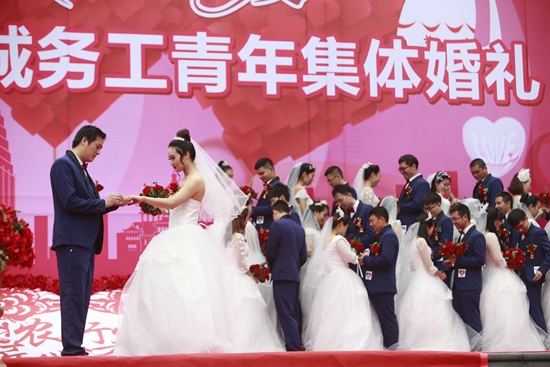 11月5日,在第十个“重庆农民工日”来临之际,重庆88对优秀进城务工青年参加了一场声势浩大的集体婚礼。视觉中国供图