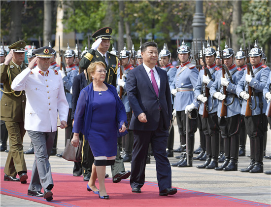 当地时间下午4时30分,习近平乘车在智利马队护卫下抵达宪法广场,受到巴切莱特热情迎接。奏中智两国国歌后,在巴切莱特陪同下,习近平检阅陆军仪仗队和总统卫队。习近平向巴切莱特介绍中方陪同人员,巴切莱特向习近平介绍智方主要官员。