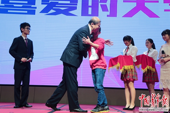 颁奖典礼上,奖杯之外,接到学生童志龙颁发的印有其头像的棒球帽,四川师范大学党委书记、校长丁任重立刻骄傲地戴上,引得台下一片掌声。