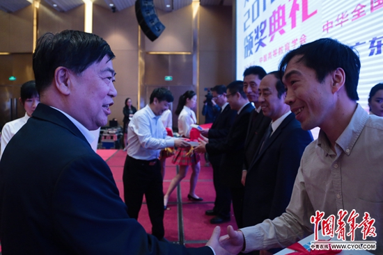 1月7日,广东省顺德,2016年学生喜爱的大学校长颁奖会,中国高等教育学会会长瞿振元等嘉宾向校长赠书。中国青年报·中青在线记者 赵迪/摄