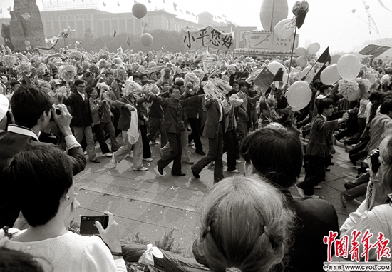 1984年10月1日,参加庆祝中华人民共和国成立35周年群众游行的北京大学学生,突然举起“小平您好”的横幅,通过天安门广场。本报记者 贺延光/摄