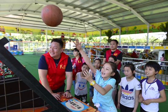 5月24日,河北省邢台市留守家庭服务协会会员李义超(左一)带领留守儿童玩投篮。六一儿童节将至,河北省邢台市留守家庭服务协会开展“迎六一 情暖留守儿童”志愿服务活动。志愿者带领留守儿童来到当地游乐场,与他们一同游玩嬉戏,为他们送去节日的祝福。陈雷/摄(新华社发)