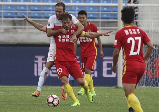 2017年7月9日,长春,2017中超第16轮,长春亚泰以4∶2战胜上海上港。图为卡瓦略(上海上港,白衣)防守胡斯蒂(长春亚泰,红衣)时非常被动。视觉中国供图