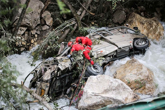 16时9分,王翔宇系好安全绳,钻过公路围栏,滑下陡坡,从河水中的一块巨石跳上另一块巨石,再纵身跳上了中巴车。他的队友紧随其后,登上了车身。