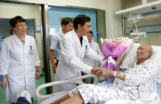 1个多月后,老李拔掉气管插管,第一次吃上了面条。护士给他刮了胡子,还推着他去外面透风。在康复的日子,有人来看望他,他对着他们双手竖起了大拇指。这点赞既是为庆祝自己大病初愈,也是给参与救治的120名医生护士。
