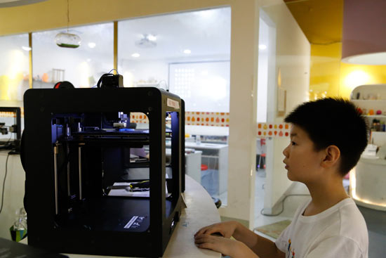 8月9日,杭州,一名小朋友在观察3D打印机。每到暑假,许多家长会带着孩子到科技馆、博物馆等地体验科学乐趣。视觉中国供图