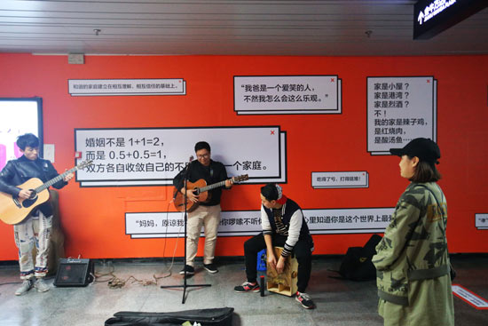 10月11日,成都地铁一号线人民北路站个一个通道里,橙红色的墙壁上写着许多充满温情的家庭对话,其中一些是爸爸妈妈对远在他乡儿女的关心、问候和牵挂,感人肺腑,催人泪下。