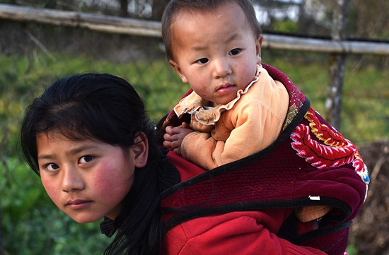 2017年12月15日,云南龙陵县,女孩尹彩香在帮人照顾孩子。尹彩香今年10岁。她6岁那年,曾在矿上打工的父亲尹可顺患上尘肺病,母亲提出离婚,她再也没见过母亲。现在,她盼着自己快点长大,去外面打工赚钱。父亲说,女儿年纪还小,干不动体力活,现在他就盼着自己的病能多拖几年。“等女儿长大了,我闭上双眼也就安息了!”视觉中国供图