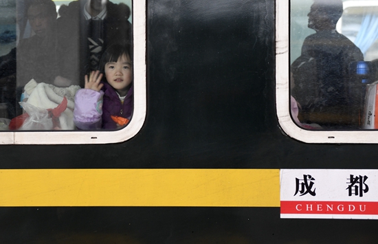 1月31日,在杭州火车站,一个小女孩在发车前朝窗外张望。2018年春运于2月1日启幕,至3月12日结束,共计40天。新华社记者 黄宗治/摄