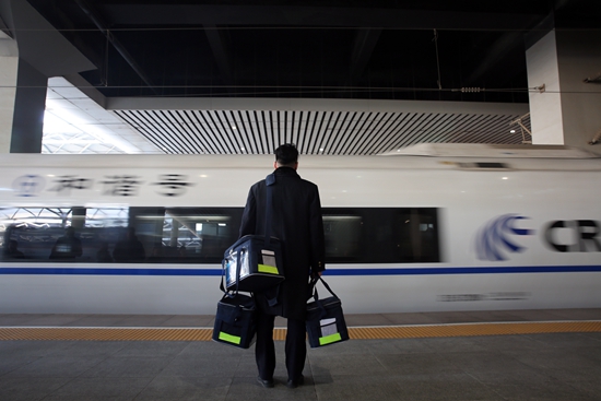 2月6日,在河北省石家庄站16号站台上,配送员田睿等待列车停靠。