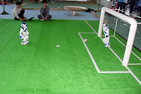 3月29日,大学生团队演示他们研发的机器人足球。当天,教育部在厦门大学举行新闻发布会宣布,今年的第四届中国“互联网+”大学生创新创业大赛起全面启动。 视觉中国供图
