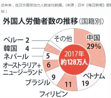 其中,留学生和技能实习生(赴日学习劳动技能的人)群体中的在日工作人数大幅增加,同比增长20%。其中,从国别来划分,中国以37.2万人、占比29%居首,其次是越南、菲律宾、巴西,分别占比19%、11%和9%。