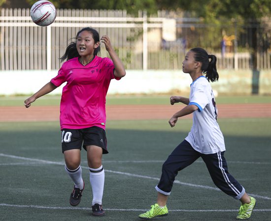 卫宇琼(左)在训练中拼抢(5月16日摄)。在贵州省黔东南苗族侗族自治州榕江县古州镇第二小学,14岁的侗族女孩卫宇琼有一个梦想——入选女足国家队,然后代表中国征战世界杯。