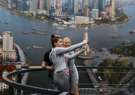 6月13日,在塞尔维亚首都贝尔格莱德,人们在“360度上海”体验型图片展现场自拍。