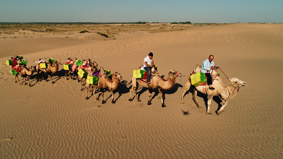 组建驼队的,是巴楚留香瓜项目负责人益明。7月初,他们发现,不少绿洲瓜田交通不便,就组建了一个骆驼队。驼队的领队为维吾尔族老人拜克热·麦麦提,从20岁开始赶了几十年骆驼,后来交通发达了他和骆驼都退役了。他说,没想到,自己还有机会“重闯江湖”。