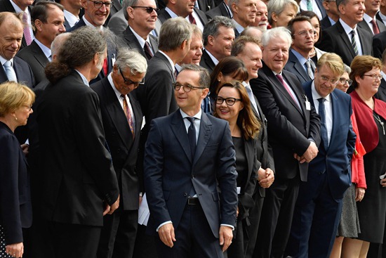 8月27日,在德国柏林,德国外长海科·马斯(前中)与德国驻外使节合影。德国外长海科·马斯27日在柏林说,要打造“多边主义者联盟”来制衡美国方面的“美国优先”理念。 新华社/法新