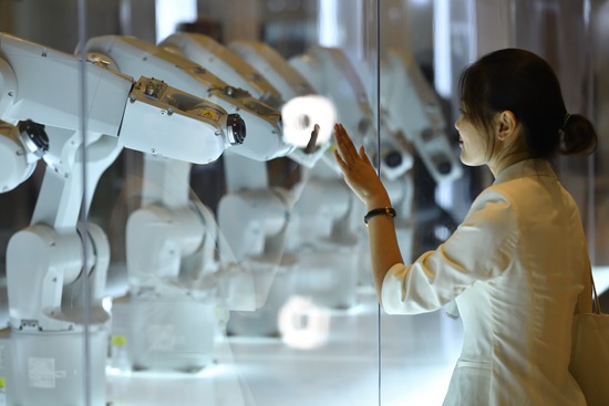 9月18日至20日,世界经济论坛第12届新领军者年会(俗称夏季达沃斯)在中国天津召开,本届年会将是迄今为止规模最大的以第四次工业革命为主题的世界经济论坛峰会。会场内,感知机器Manus对挥手者做出回应,在人与机器之间培养共情。 视觉中国供图