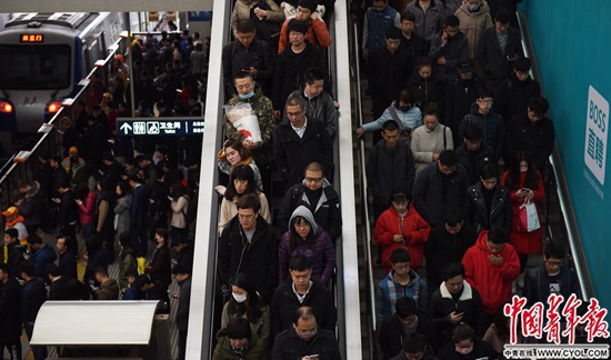 晚上6点半,西二旗站的客流量达到峰值,站外的长队沿着限流通道缓慢移动,站内已经被黑压压的人群塞满。人们呼出的热气向上蒸腾,有人敞开了棉衣,相比下午,站厅里的温度上升了6℃。