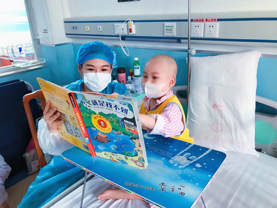 这是她参加“温暖朗读者”活动的第一天。在南方医院儿科住院部,她刚刚经过了门口那几间普通病房,经过了那些忙忙碌碌的医生护士和进进出出的家属,才来到里面一排排病房。这里住的都是身患血液病或癌症的重症儿童。