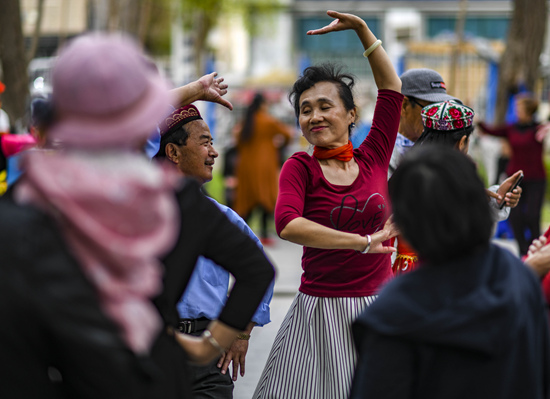 4月10日,在新疆库尔勒市人民广场,市民跳起欢快的麦西来甫。在库尔勒市人民广场,每天都会有市民来到这里,伴随着美妙的音乐,跳起欢快的麦西来甫。在和煦的春风里,人们和谐相融,尽情享受音乐和舞蹈之美。新华社记者 赵戈/摄