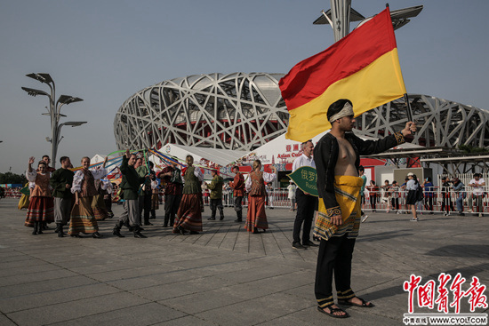 5月16日,北京奥林匹克公园,亚洲文明巡游活动上,俄罗斯表演团队向观众挥手致意。中国青年报·中青在线记者 李峥苨/摄